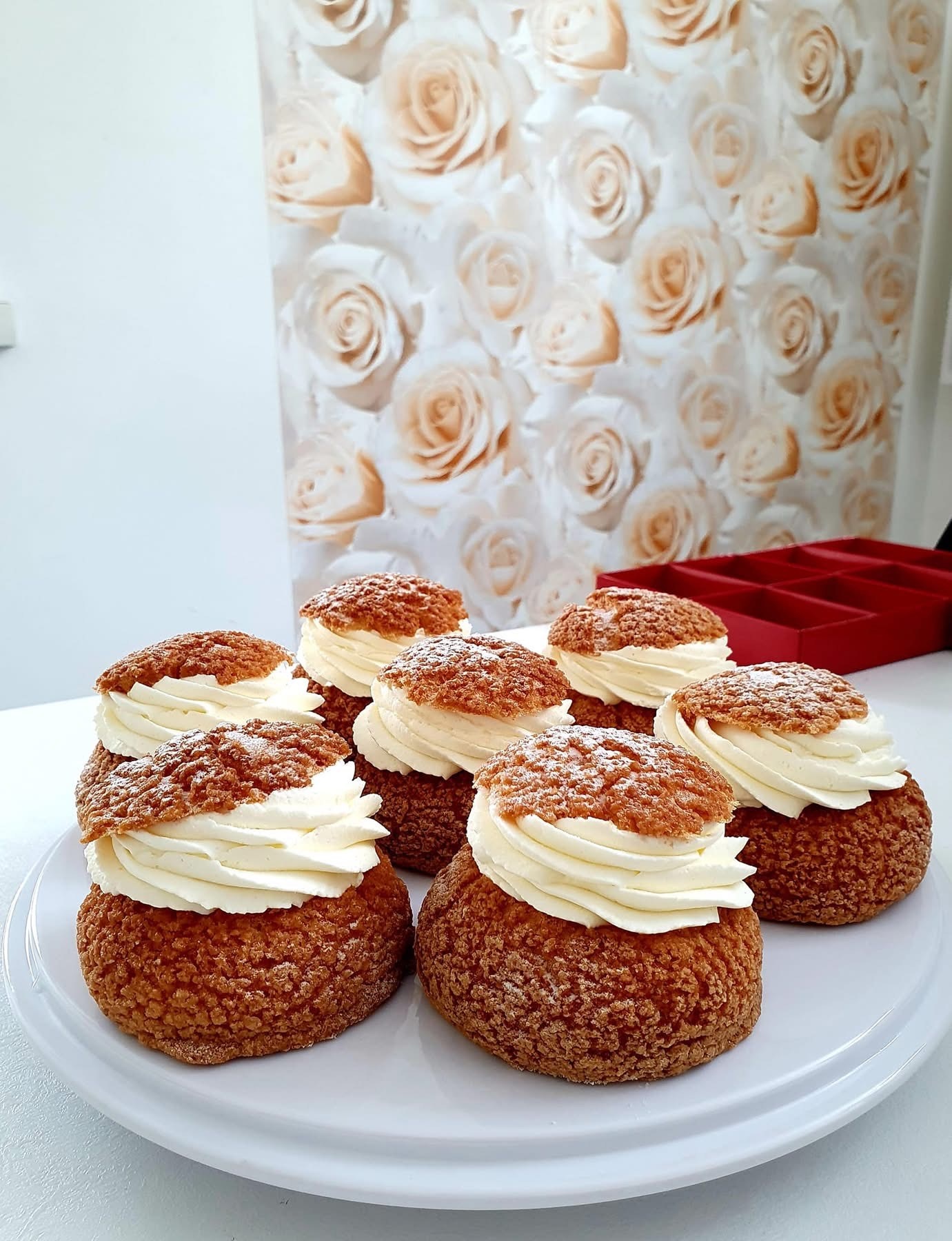Imelised krõbekattega profitroolid. Täidiseks vanilje keedukreem ning keedis, peal vahukoore kreem.