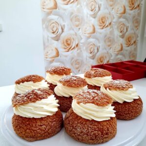 Täidiseks vanilje keedukreem ning keedis, peal vahukoore kreem.